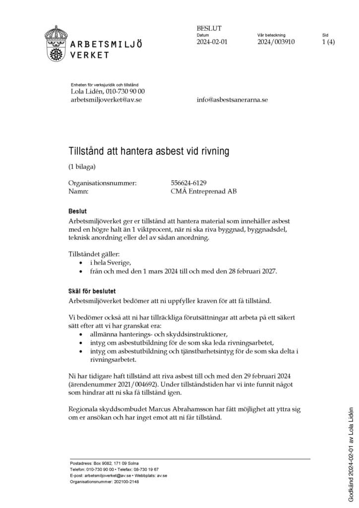 Ett beslut från Länsstyrelsen Stockholm daterat 31 mars 2023. Dokumentet beviljar CMÅ Entreprenad AB (organisationsnummer 556624-6129) tillstånd att transportera farligt avfall som uppkommer i yrkesmässig verksamhet, i enlighet med avfallsförordningen (2020:614). Tillståndet omfattar specifika avfallskoder, bland annat: 17 06 01* Isoleringsmaterial som innehåller asbest. 17 06 05* Byggmaterial som innehåller asbest. 17 09 02* Bygg- och rivningsavfall som innehåller PCB-produkter. Tillståndet gäller till den 29 februari 2028 och omfattar Stockholm kommun. Dokumentet anger även villkor, bland annat att verksamheten endast får bedrivas av personer med nödvändig kunskap och utbildning, samt att fordon för transporten ska vara lämpliga och utrustade med skyddsåtgärder.